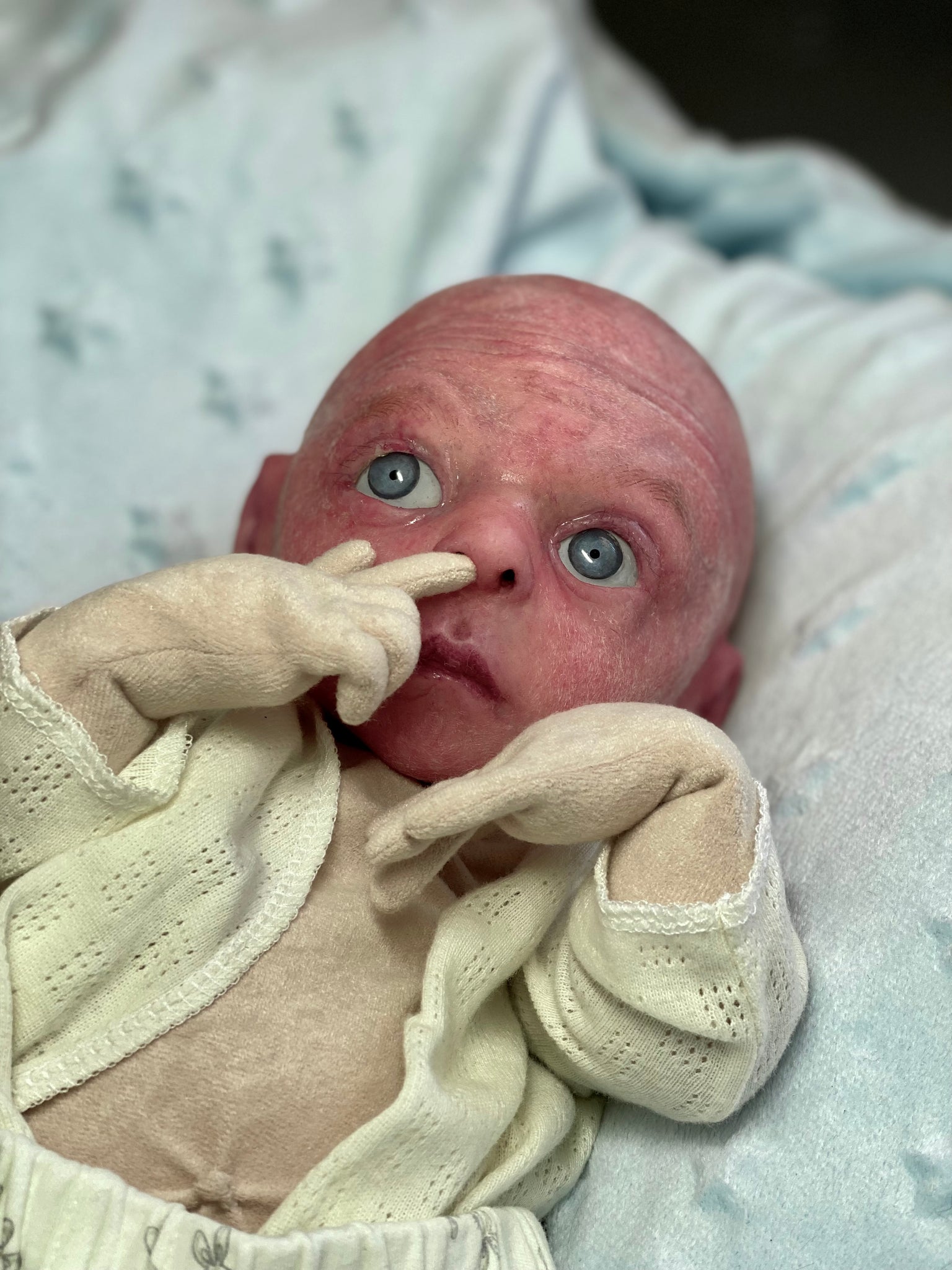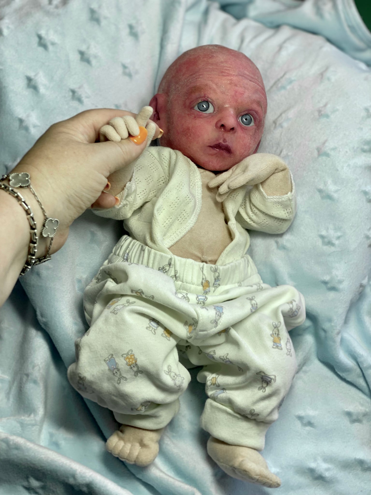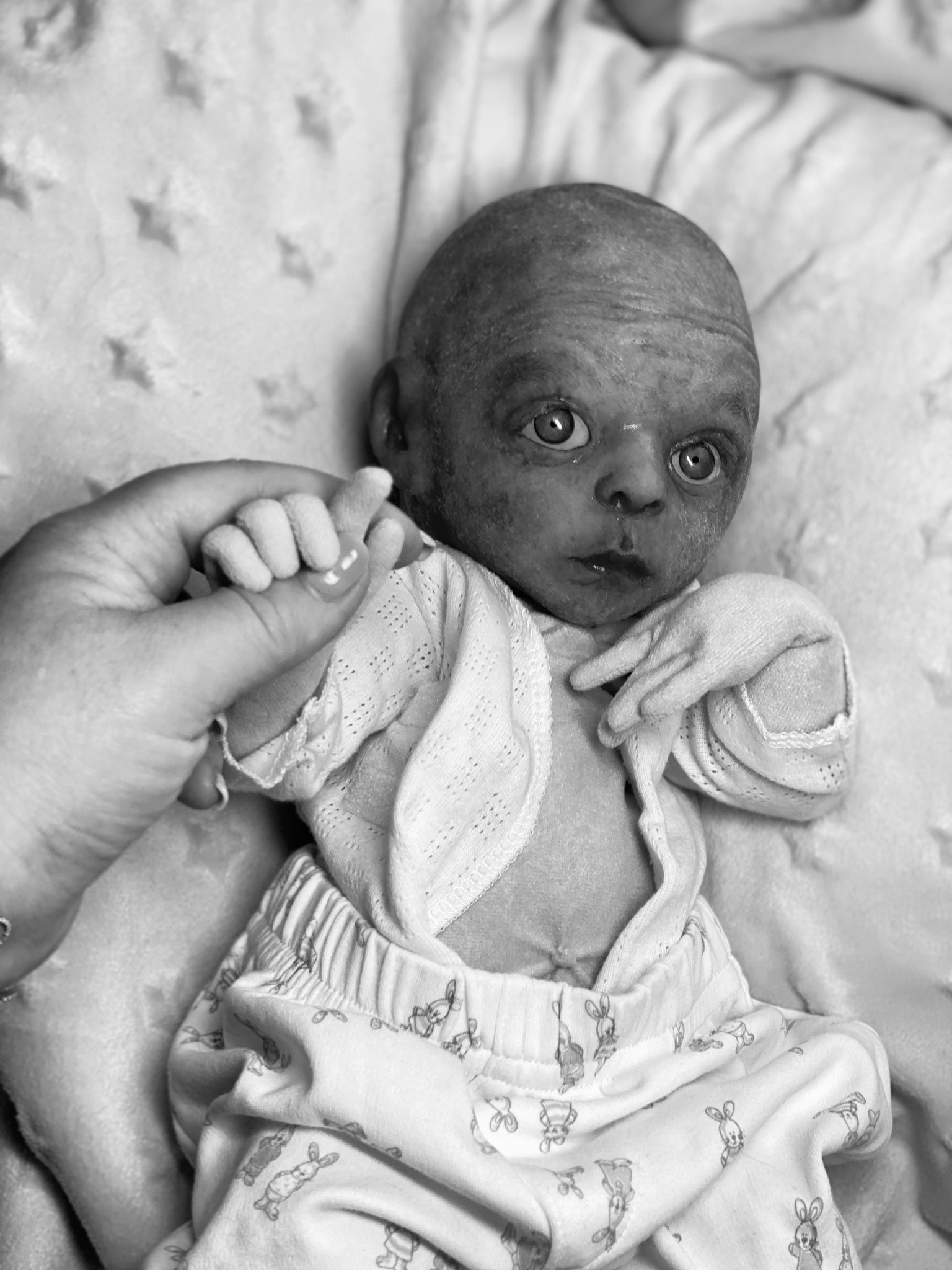 He has got sculpted open mouth with removable tongue, applied baby lanugo, painted barely there eyebrows, rooted barely there eyelashes 💕