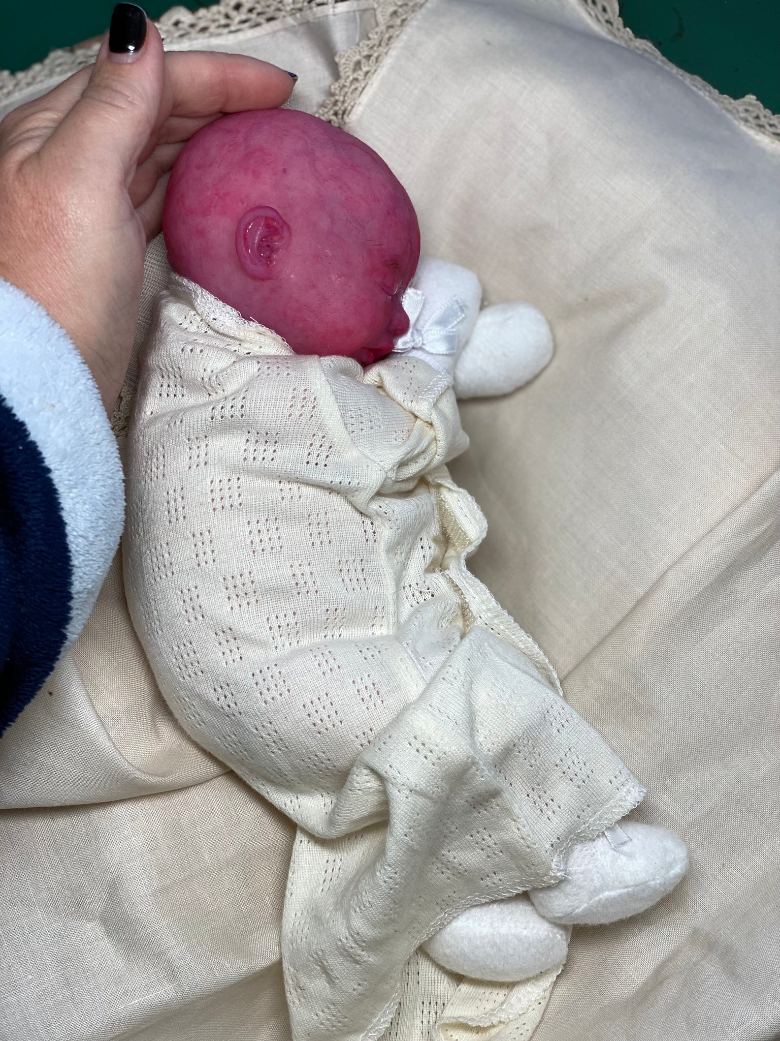CUDDLE baby Sallie (soft blend silicone head with weighted soft suede cuddle body), can be a boy or a girl, painting as a ultra premature baby - this matches her size, which is 10” 😍