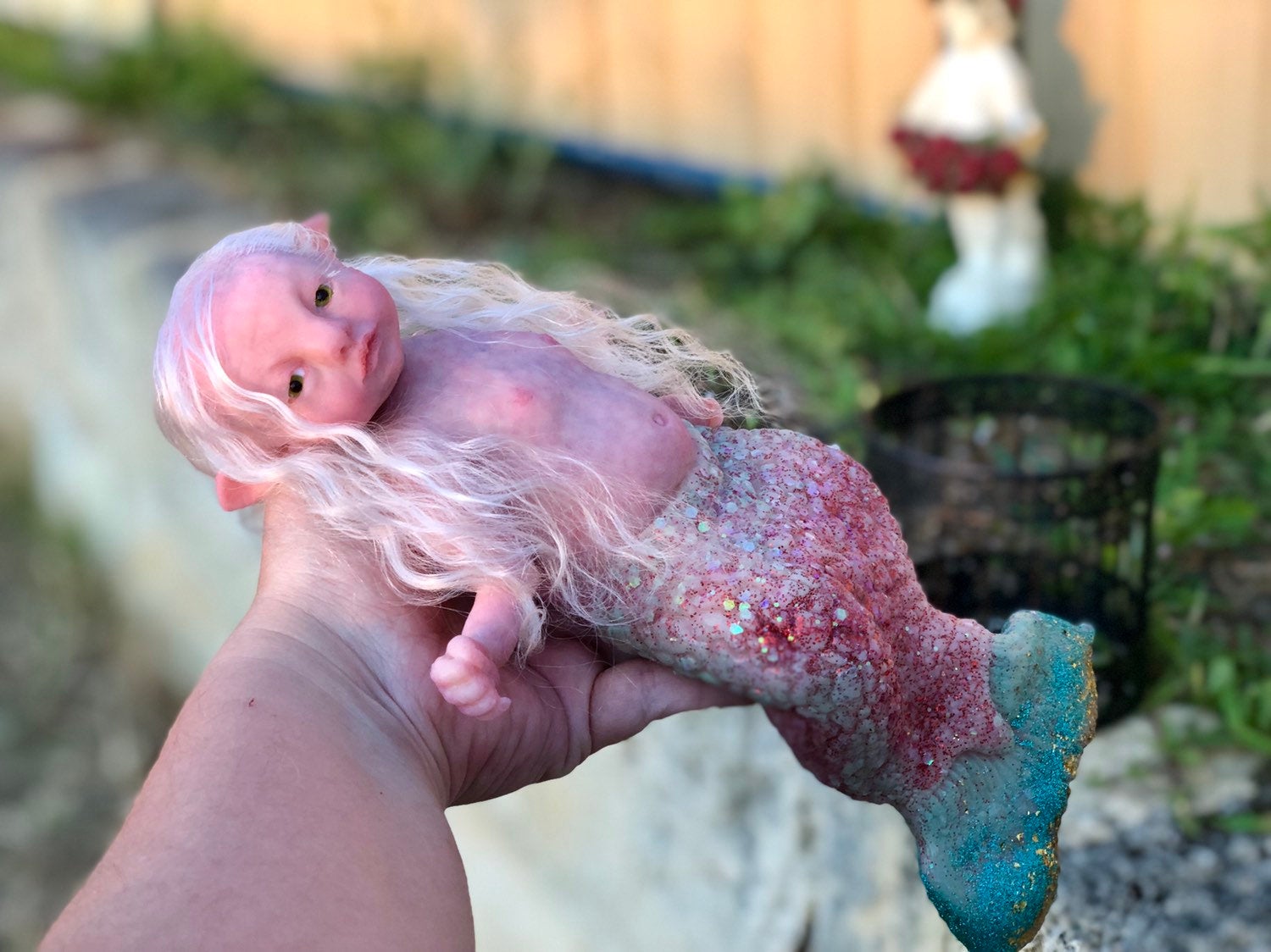 Full body silicone baby mermaid 10” Full body silicone fantasy baby mermaid - in super soft & squishy platinum silicone blend (marshmallow blend) created by me. She has got open eyes (glass eyes). I have painted her with the extreme attention to the details (mottling, shading, blushing, veins on her body & head), her tail is very eye catching due to the painting technique & sparkles, mica powder & golden flakes added. She can be bathed & will be a decoration of any collection ❤️. She was rooted with the premium quality mohair & also has rooted blonde eyelashes that give her the most subtle look. 💖💖💖 Spoil yourself with a beautifully detailed & squishy baby 💖💖💖 Will come with the outfit, dummy, bottle, teddy, blanket. VIDEOS Silicone mermaid twins - cutenesses overload ❤️❤️❤️ https://youtu.be/qkPc1Dr5GbY Painting silicone mermaid https://youtu.be/wkChPneDfYQ Please refer to my website for the full version of terms and conditions as well as for MUCH MORE pictures of her as Etsy only allows 10 & it’s impossible to show all her detailing in 10 pictures. http://www.nadinedolotovadolls.com/