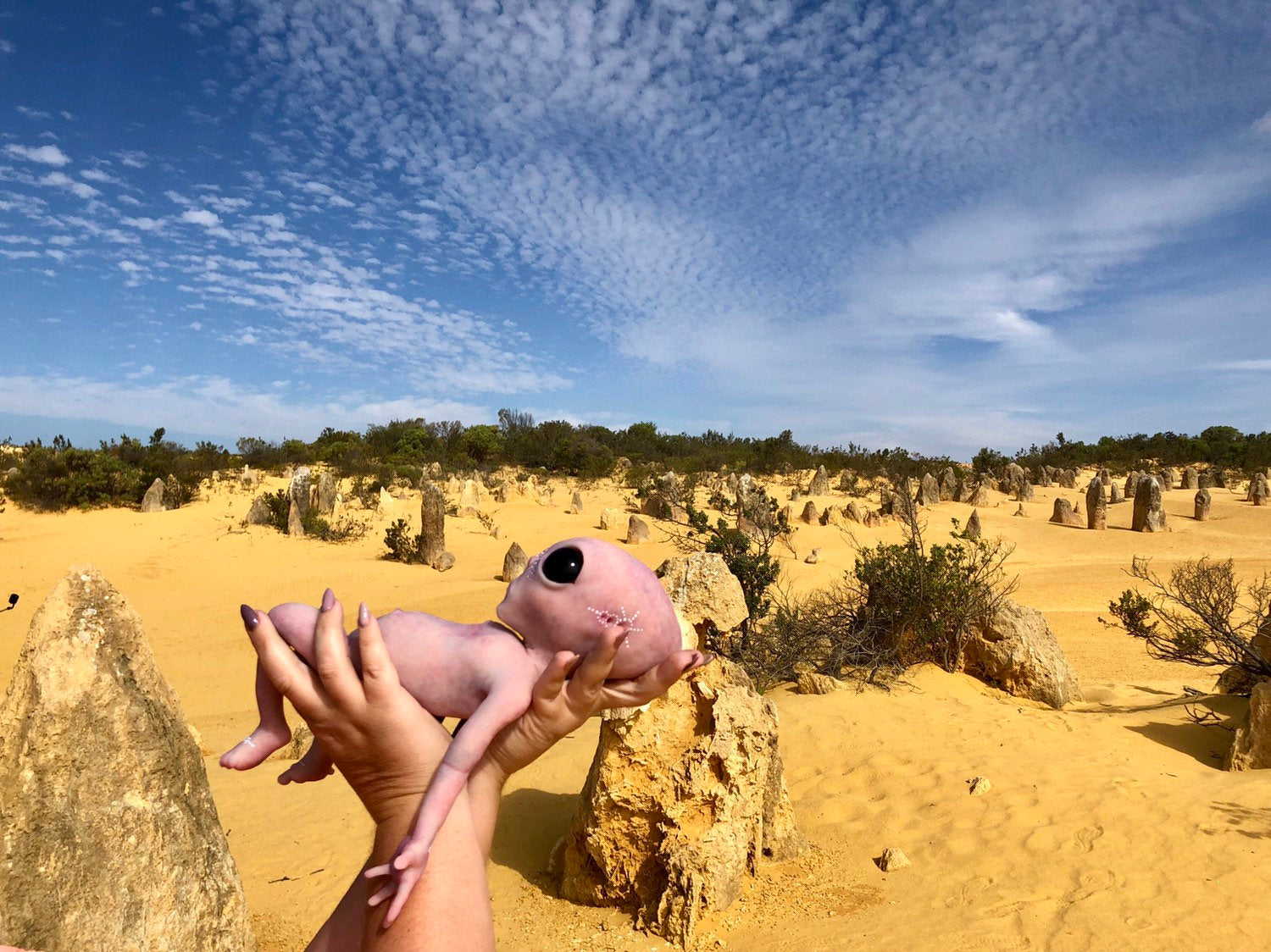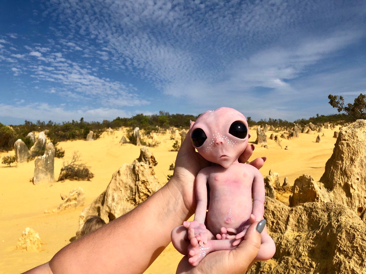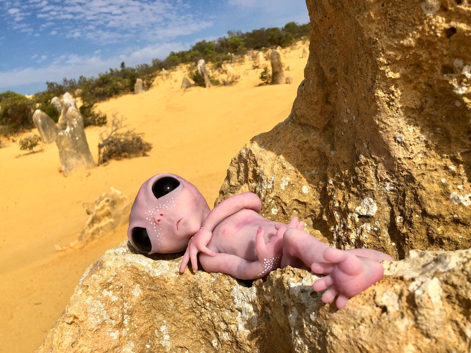 Full body silicone baby alien sculpted, molded, poured in super soft platinum cure silicone blend & painted by me.