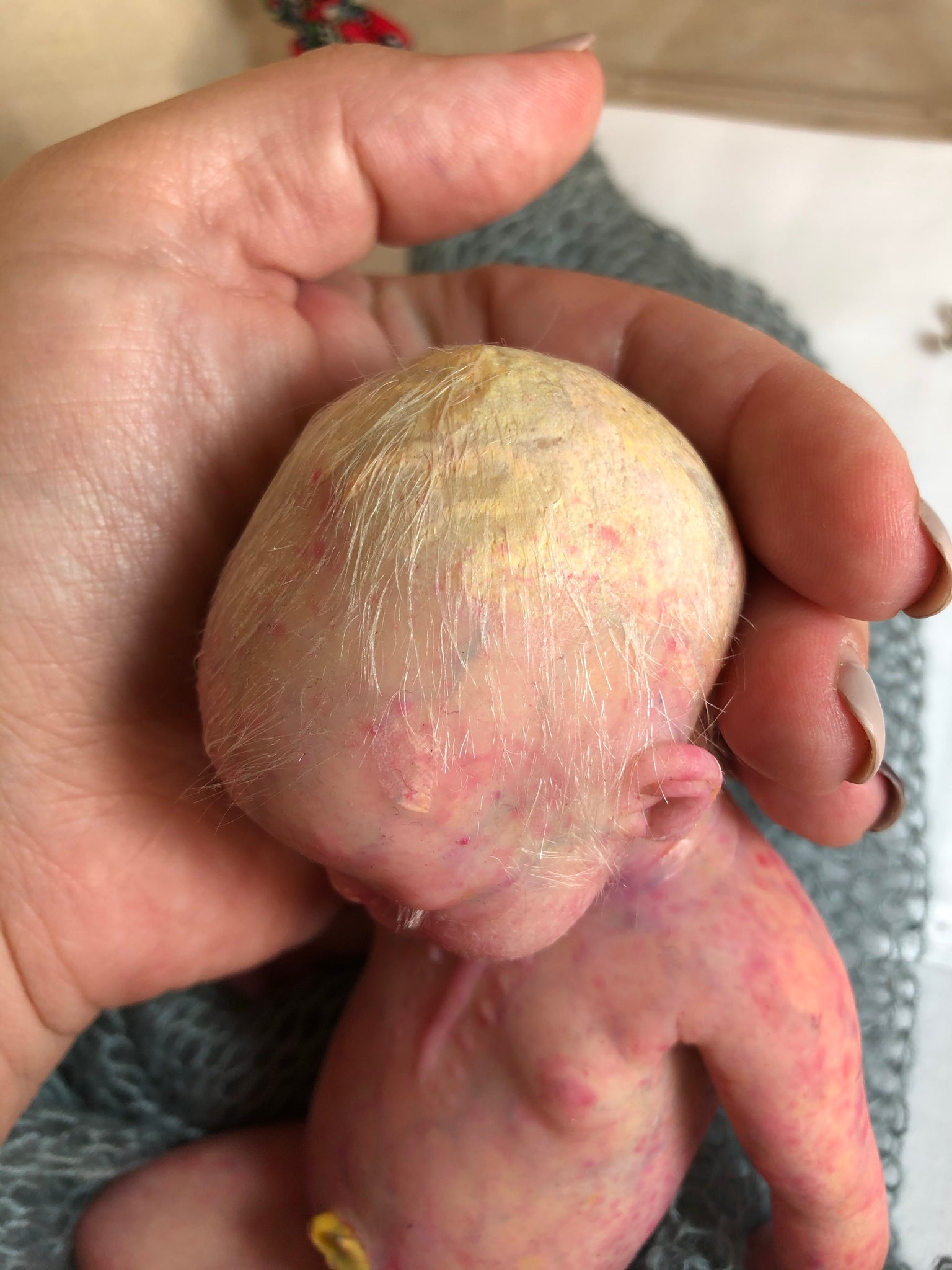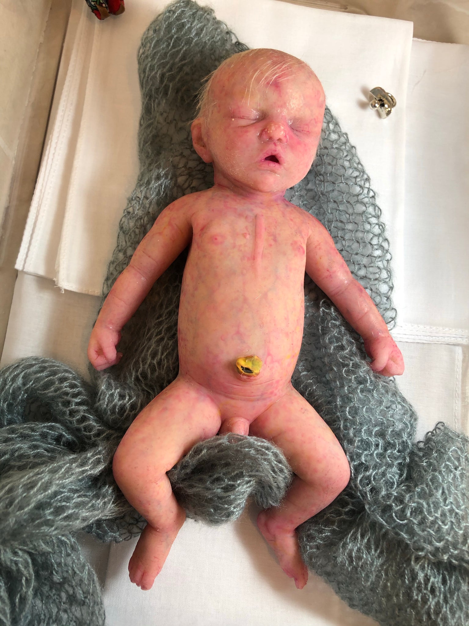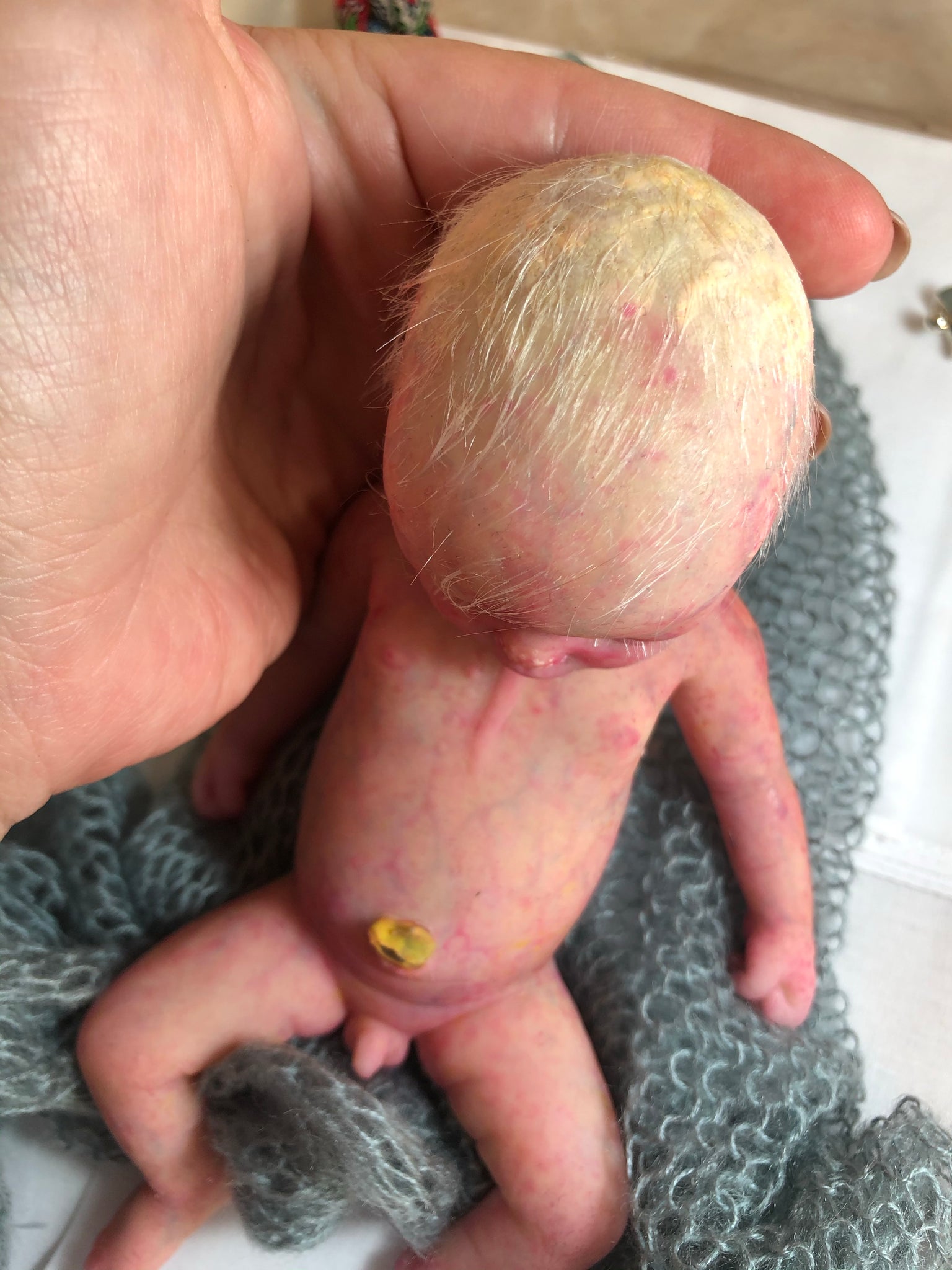 He was poured in super soft marshmallow platinum silicone blend, I gave him a 3d scar sculpted in silicone. He is extremely detailed- his little tongue is hand sculpted in silicone & painted very realistically, he has got 3 d veining & micro veining (he resembles a premature baby with almost translucent skin). I gave him a belly button stamp for extra realism.