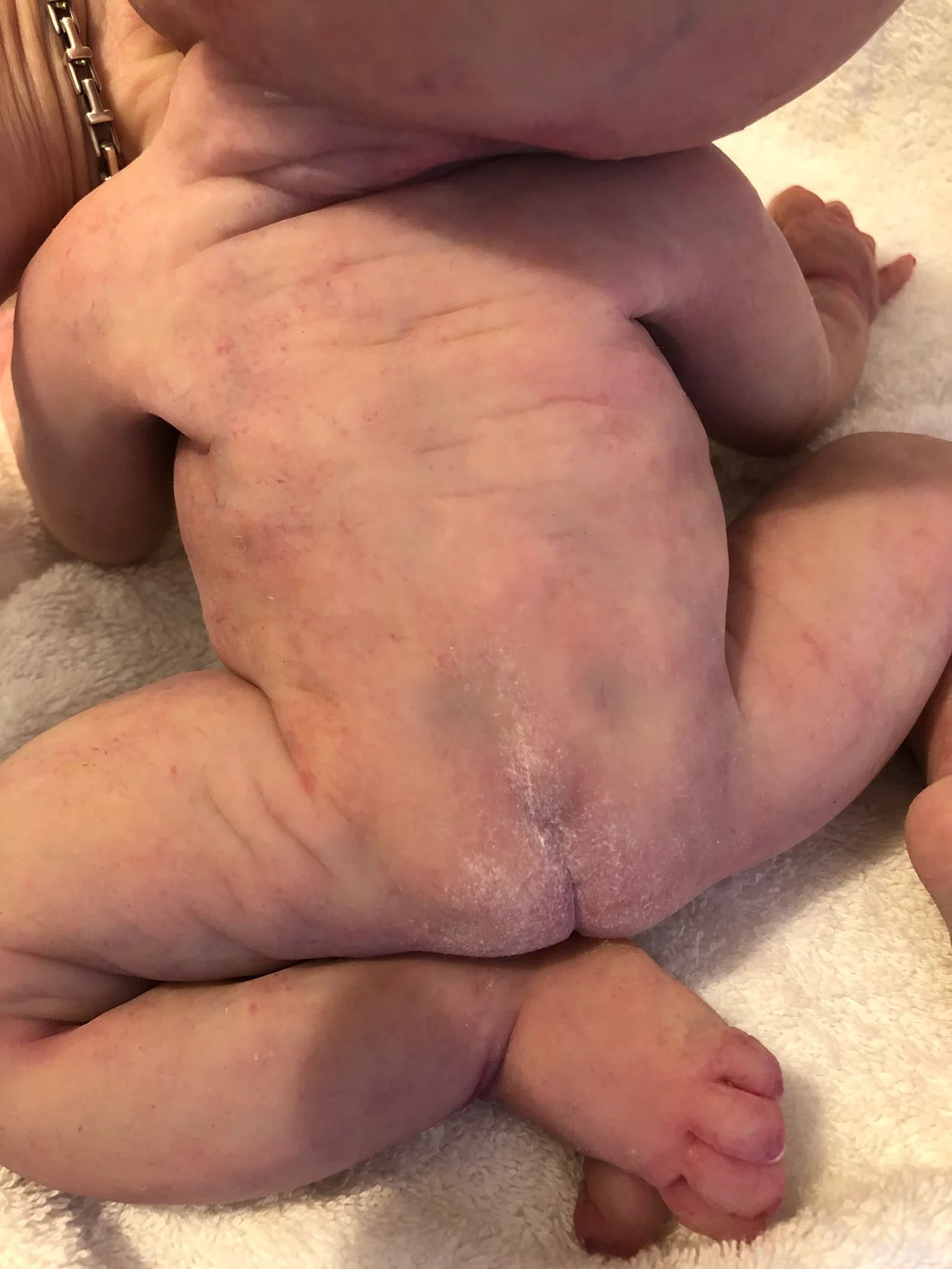 She has baby peachy fuzz (baby hair, lanugo) on her cheeks & bum cheeks.