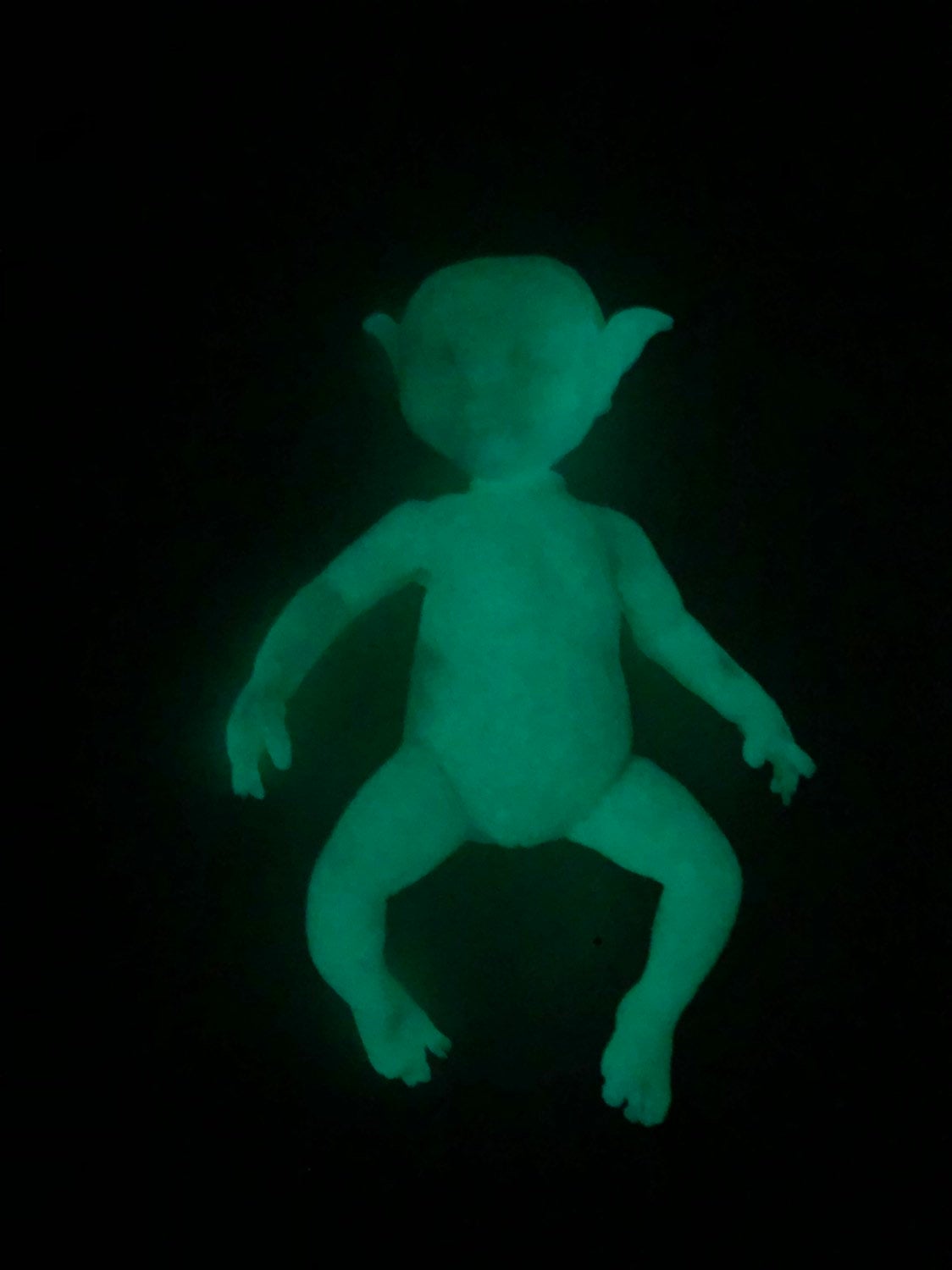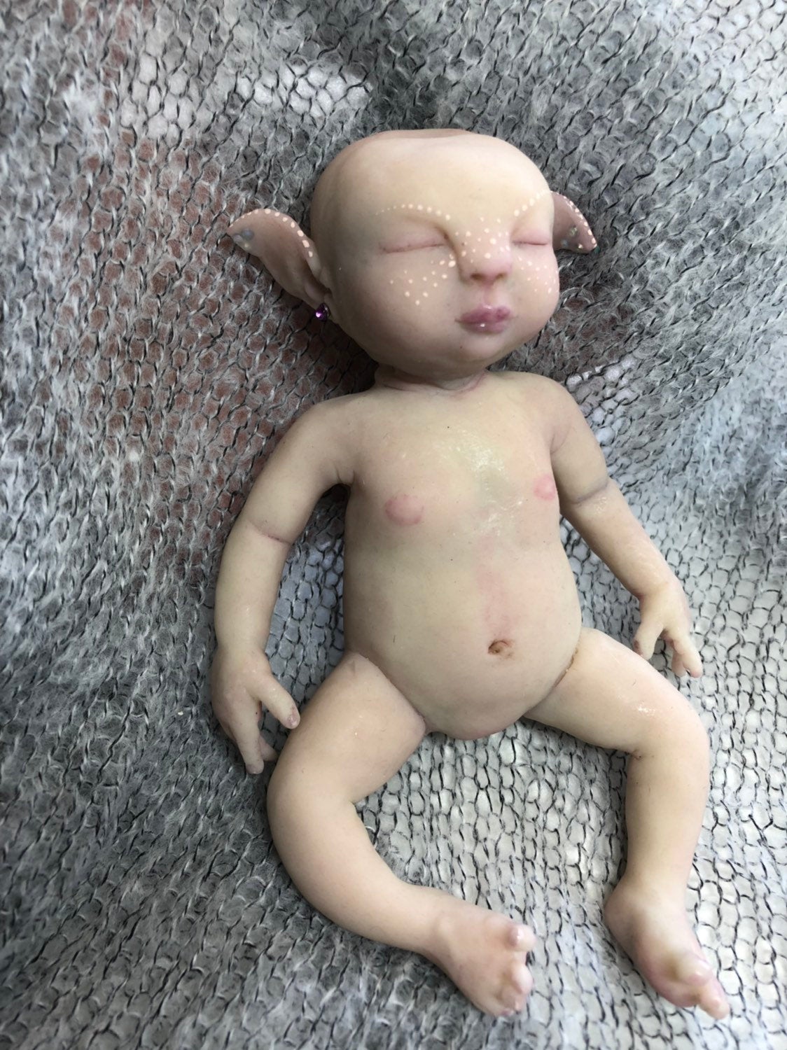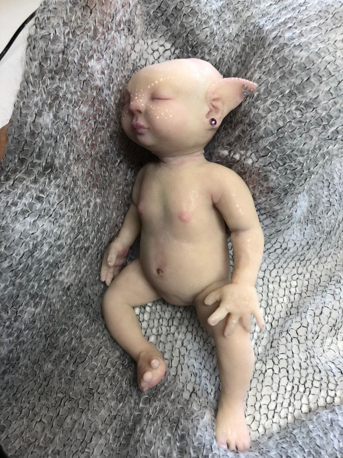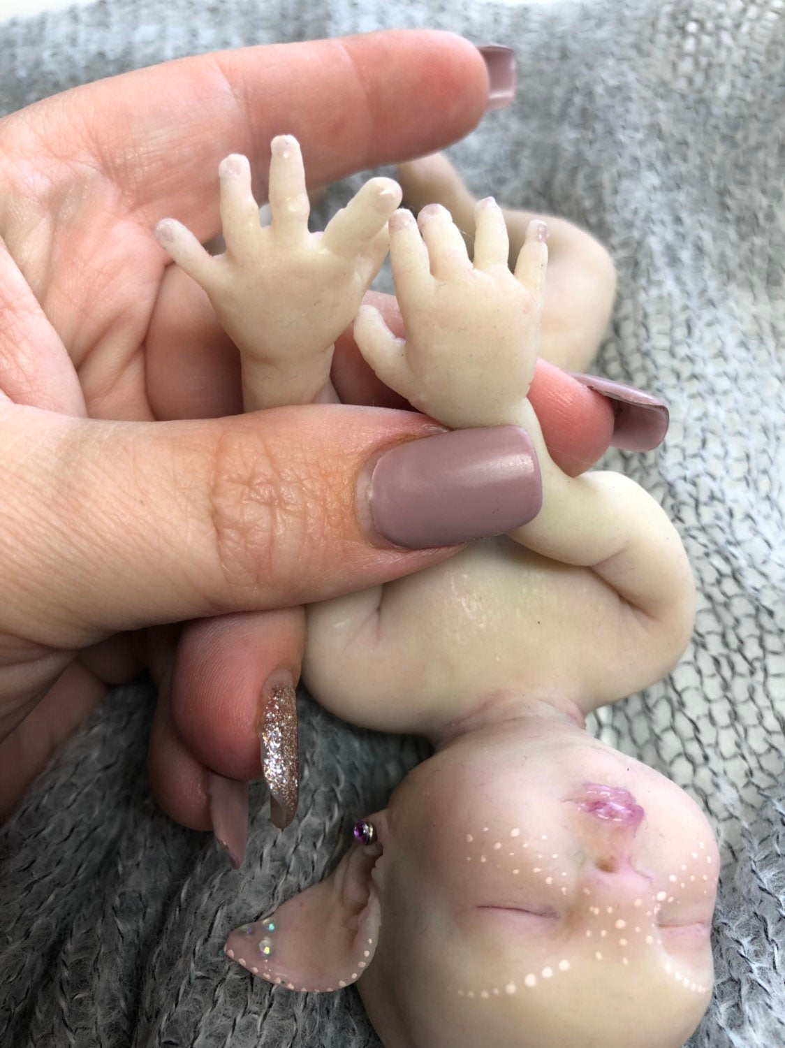 AVAILABLE, READY TO SHIP!!!💖 SHE GLOWS IN THE DARK & CHANGES HER COLOUR DEPENDING ON THE TEMPERATURE 💕💕💕 6.5” full body silicone fantasy baby girl (Toni sculpt by me) in super soft blend, sleeping. LTE of 40 maximum worldwide, sculpted, poured and painted by me, fused head, open mouth, all fingers & toes are separate, painted & glossed nails (with nailtips), lips & eyelids. Painted barely there eyebrows. Really squishy and soft, like a marshmallow. Please contact me if you need any information or more pictures 😊 She comes with the handmade bottle, teddy, dummy, blanket, earrings, COA. https://www.facebook.com/2304719746472866/posts/2329349757343198?s=100013835131154&v=i&sfns=mo http://www.nadinedolotovadolls.com/ .