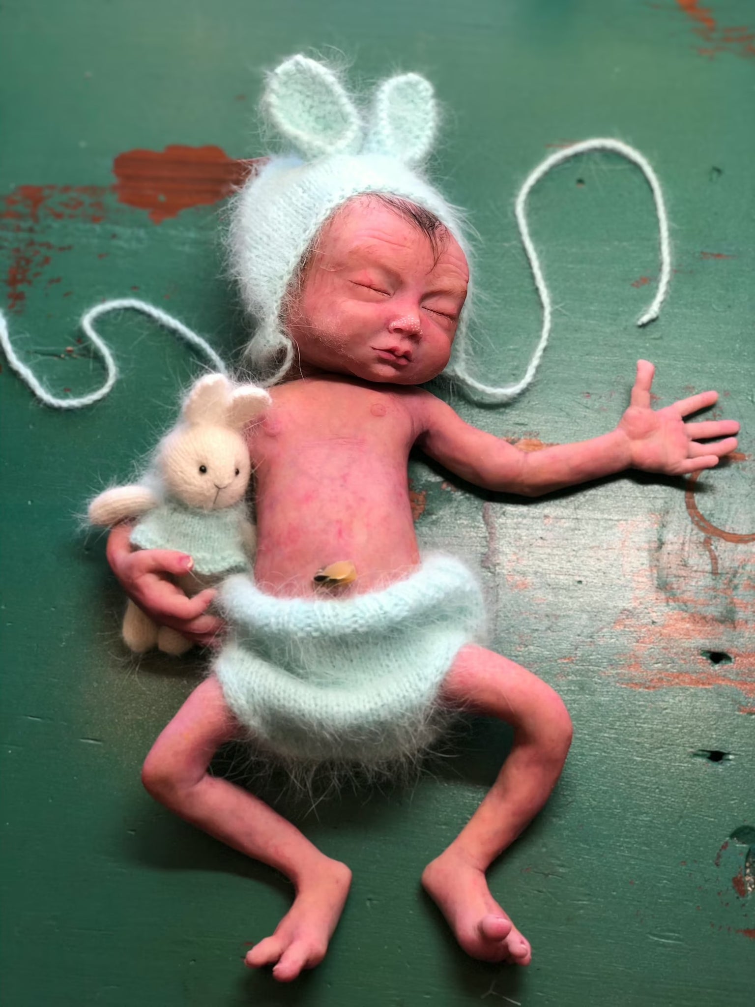 Full body silicone baby Collette 12” with legs stretched 1.5 pound (she was sculpted, moulded & casted by me in super soft platinum silicone blend, painted with silicone paints and matted with SAM silicone matting powder). Her nails, lips, inside of the ears and nose, eyelids are glazed to add her realism.