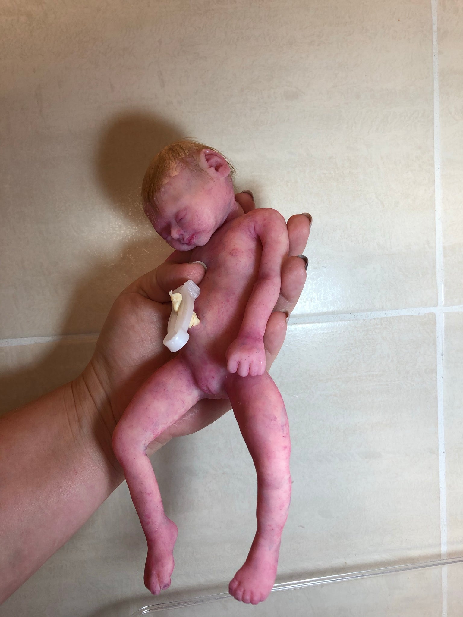Creating this tiny preemie full body silicone baby girl I have tried my best to make her as realistic as possible. She is a just born ultra premature baby (around 9”), sculpted, molded & poured by me in super soft platinum cure silicone blend (way softer than eco 20, really squishy like a marshmallow) with some flocking added (a few colours), which created a 3D effect even before painting.