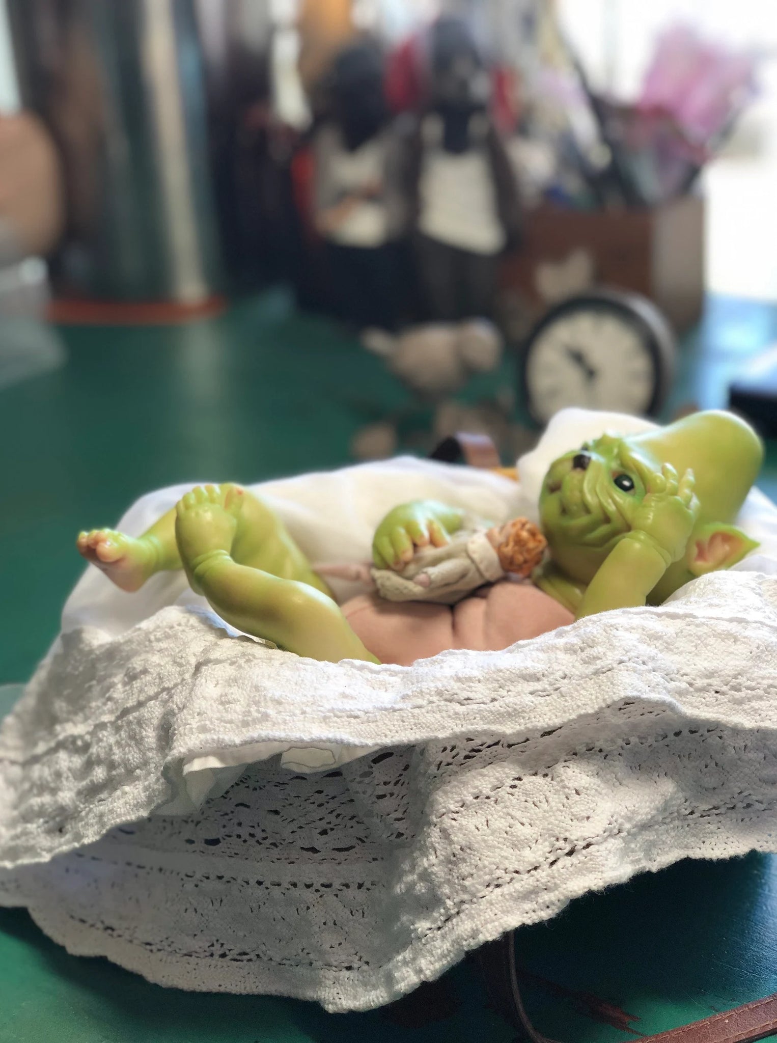 Custom Reborn fantasy vinyl baby Ozzy by Nadine Dolotova (Grinch / Werewolf / Elf inspired) 11-12” with cloth body.