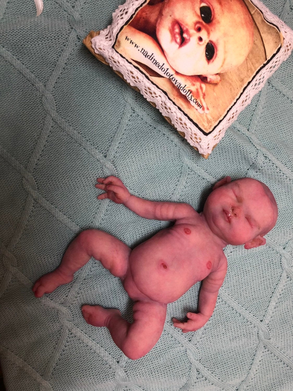 Please welcome my newest squishy beauty- Arisha sculpt in marshmallow silicone - she is INCREDIBLY soft & cuddly 🥰🥰🥰 She is around 11”, she was sculpted &painted in a very detailed way, veins, mottling, capillaries, milia (baby milk pimples), baby lanugo (facial hair), barely there painted eyebrows, etc. I will matte her tonight (that’s why she looks a bit shiny on the pictures, she still needs matting) & she is ready to go home or you can order rooting for extra 150 Australian dollars & she will grow some hair ❤️ She has got chubby tummy, fat baby rolls all over, very detailed hands, feet & ears, open mouth no gums. I’m thinking of adding the tongue though. She was poured from marshmallow soft silicone blend with 3 D skin effect. VIDEO OF HER MOVEMENT & DETAILS: Full body silicone fantasy babies available from artist Nadine Dolotova https://youtu.be/AYDwAmBWObs Full body silicone baby Arisha in marshmallow silicone- just melts in your arms ❤️ https://youtu.be/GgGWWc6ApWk https://www.facebook.com/2304719746472866/posts/2372823166329190?s=100013835131154&sfns=mo Video of Arisha eyes closed Full body silicone baby girl Arisha - super soft, cuddly & detailed 👌🏻💗 https://youtu.be/AB31kXlzW0Y MORE PHOTOS: https://www.nadinedolotovadolls.com/blog/my-newest-creation You can find reviews and feedback on Facebook: https://www.facebook.com/Reborn-and-Silicone-Dolls-by-Nadine-Dolotova-2304719746472866/ Instagram: https://www.instagram.com/dolotovanadine/?hl=enEtsy:https://www.etsy.com/au/shop/ArtByNadineCreations/items Youtube: https://www.youtube.com/channel/UCTk93und15AR3AJGrytbu3w?view_as=subscriber