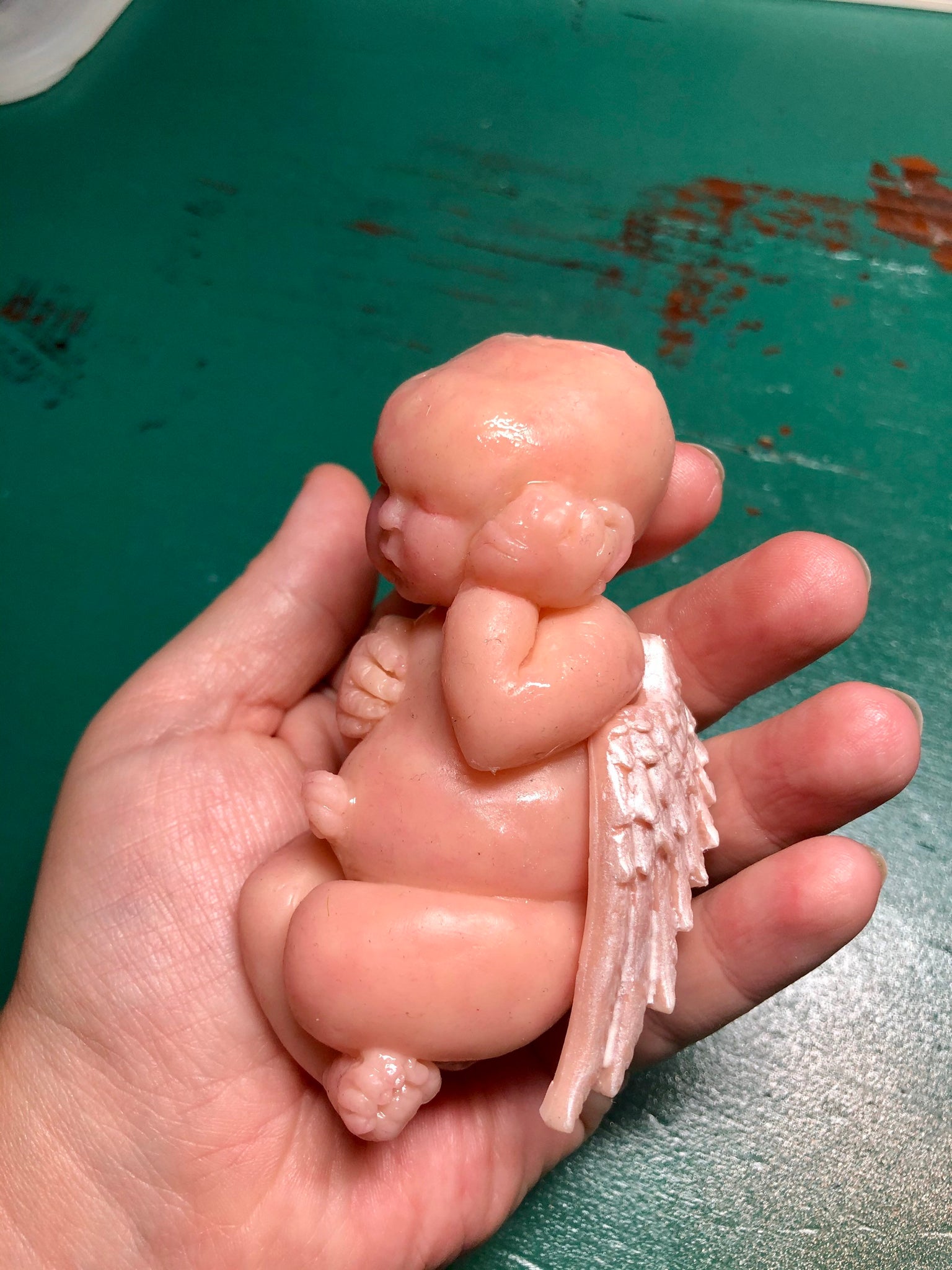 AVAILABLE FOR IMMEDIATE SHIPPING ❤️ ❤️ The pictures were taken before matting therefore she looks wet, she will be matted & will feel nice & silky. 4” full body silicone baby doll (gender neutral sculpt Nena, sculpted by me) in super soft blend, sleeping, mouth open (no gums, no tongue), pacifier supplied. LTE of 60 maximum worldwide, sculpted with extreme attention to the details. Really squishy and soft, like a marshmallow. Mouth open, takes a custom pacifier. Wings are silicone & painted white pearl. Please contact me if you need any information or more pictures 😊 She comes with the bottle, teddy, dummy, COA. VIDEO OF THE MOVEMENT & DETAILS (there is an unpainted baby on the video): Pocket baby doll in marshmallow platinum cure silicone blend by Nadine Dolotova https://youtu.be/Wto4yqTZVbI http://www.nadinedolotovadolls.com/ .